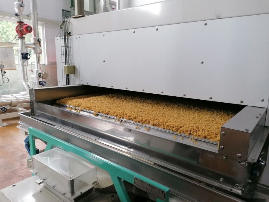 Затем нарезанные макароны подаются в предварительную сушилку – специальную камеру, где температура достигает 120 градусов. Для чего? Для того, чтобы поверхность макарон закалилась, чтобы они не слипались в дальнейшем технологическом процессе и сохраняли целостность. В этой камере макароны закаляются не более 5 минут. Далее они попадают в основную сушилку, в которой извлекается избыточная влага.