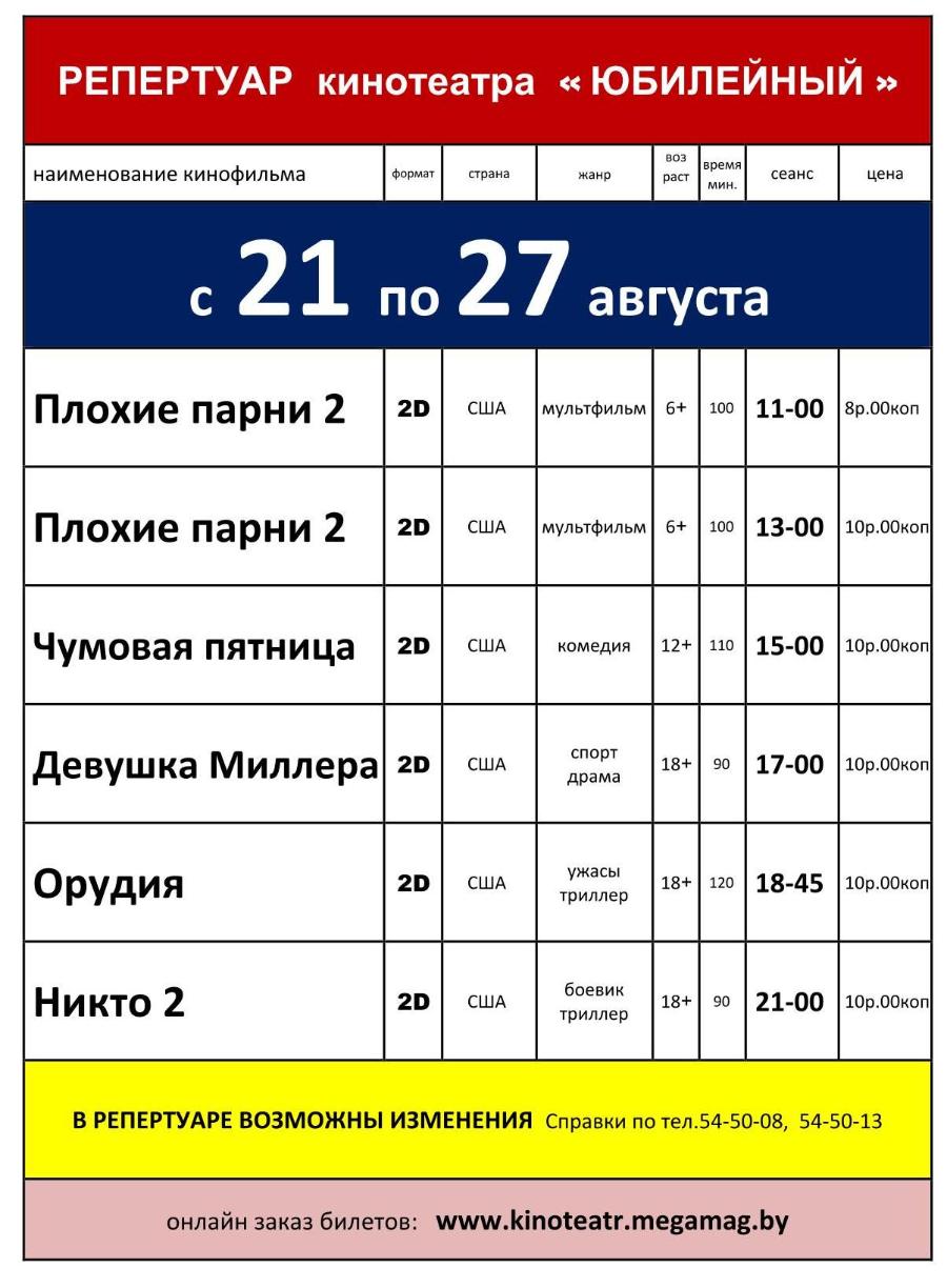 Кинотеатр Юбилейный репертуар с 21 по 27 августа