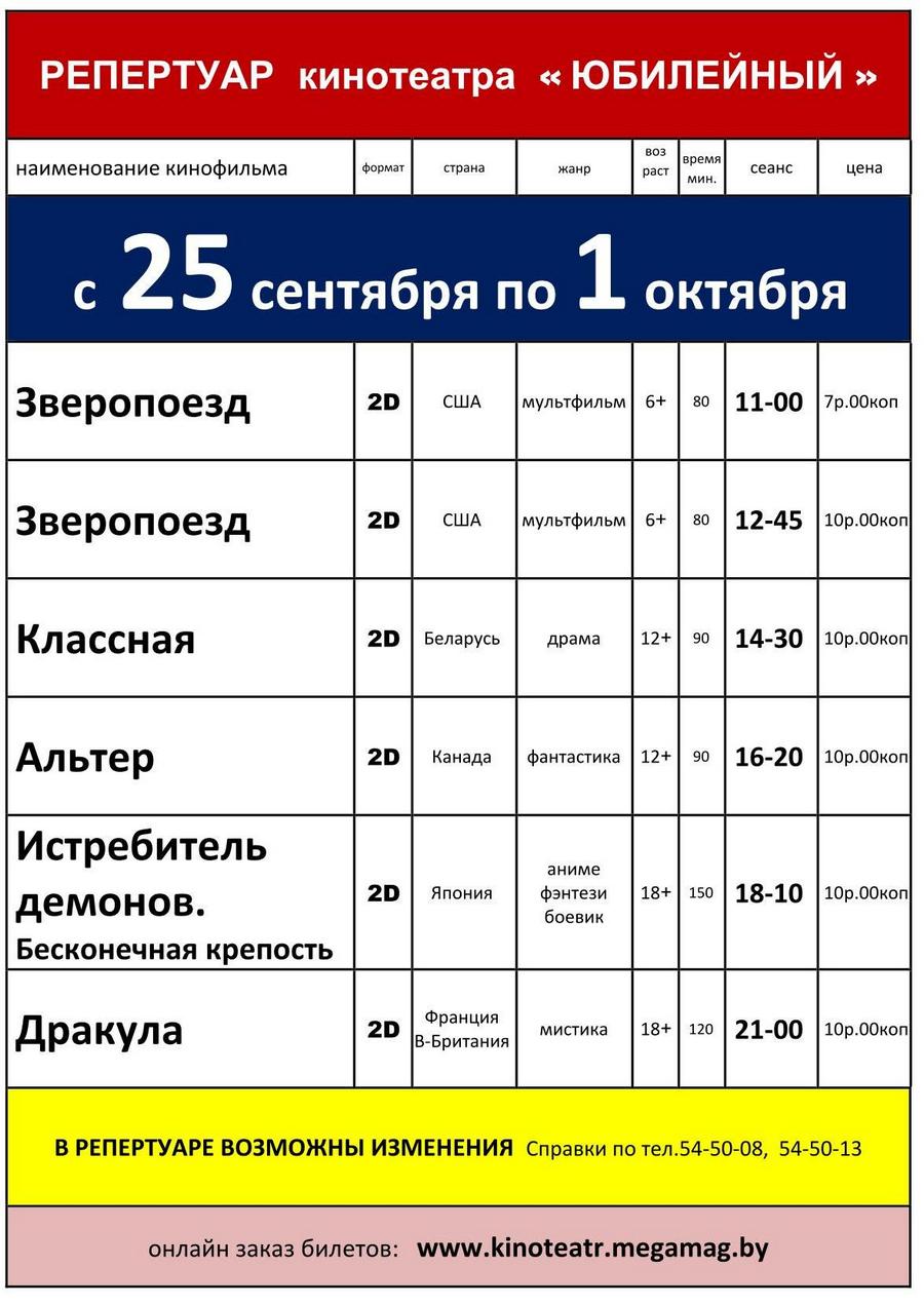 Кинотеатр Юбилейный репертуар с 25 сентября по 1 октября