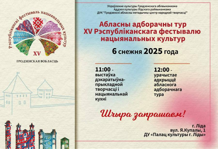 XV Республиканский фестиваль национальных культур уже во всю стучится в двери и приглашает нас в удивительное путешествие без чемоданов и виз! И именно 6 декабря состоится областной отборочный тур в Лиде.Здесь вы увидите выставки изделий мастеров народного творчества — словно прогуляетесь по ярмаркам разных стран. Попробуете национальные блюда со вкусом настоящего гастрономического круиза. Услышите песни и танцы творческих коллективов национальных диаспор — живые истории народов, которые проживают на Гродненщине.