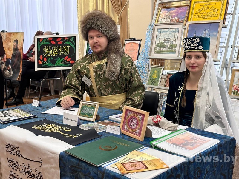 «Мы приехали из Ивья, представляем культуру белорусских татар. Ивье считается своего рода татарской столицей в Беларуси. На выставку привезли мугеры, написанные на ткани, на стекле цитаты из Корана, священные тексты. Ими традиционно украшаются дома и мечеть. Мы представили работы Эмилии Шабанович и мои», – рассказал представитель татарской общины из Ивья, преподаватель детской школы искусств Селим Ильясевич.