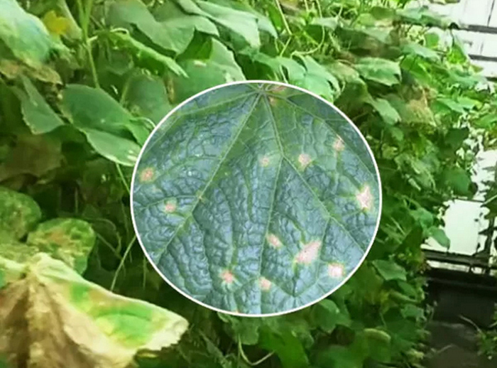 Сначала наверху листьев появляются желтоватые мелкие пятна, напоминающие веснушки, а внизу — серо-фиолетовый налет. Споры почти незаметны — рассыпаны черными точками. Затем пятна разрастаются и уходят в дымчато-коричневый цвет, а листья деформируются.