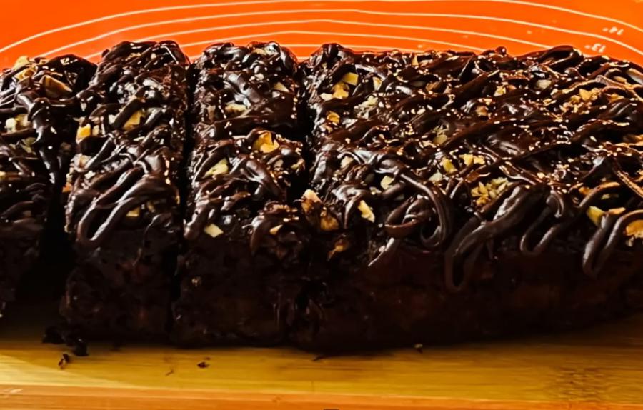 Духовку разогрейте до 180°C. Тесто переложите в форму, застеленную пергаментом (размером примерно 12x20 см), разровняйте. Сверху посыпьте измельченными грецкими орехами.