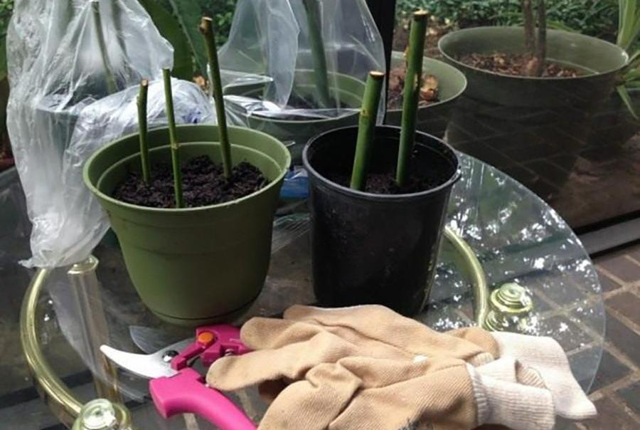 Чтобы успешно вырастить розы из черенка этим способом, почва в горшке должна быть взрыхленной и хорошо увлажненной. Растение помещается в почву, его нужно полить, а сам грунт немного уплотнить руками. Сверху его обязательно следует накрыть стеклянной баночкой, пластиковой бутылкой или пакетом.