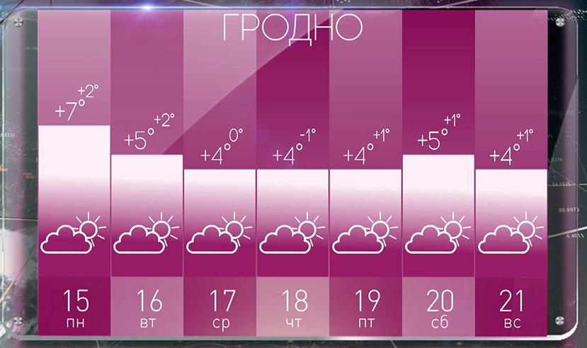 Итак, в начале недели Беларусь окажется во власти контрастных атмосферных фронтов. Будет преобладать облачная погода, в понедельник в большинстве районов, во вторник по востоку дожди с мокрым снегом. Местами туман, слабый гололед, на дорогах гололедица. Ветер северо-западный, умеренный. Влажность до 90%. Температура воздуха ночью от -3°C по северо-востоку до +5°C по западу. Днем в понедельник 0°C…+7°C, во вторник +2°C…+6°C.
