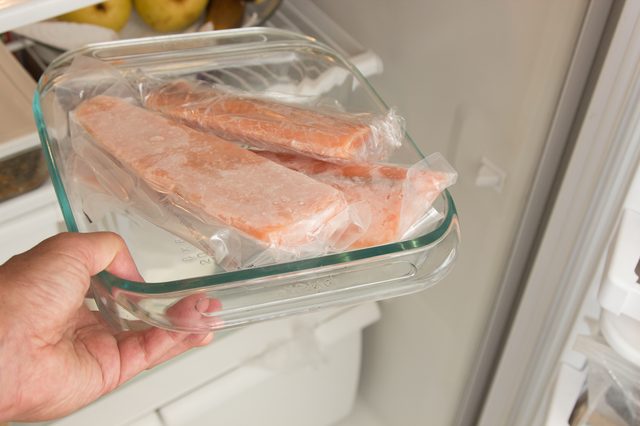 - Если вы уходите на работу, не оставляйте оттаивать еду при комнатной температуре. Лучше всего размораживать продукт в холодильнике: все, что вам нужно, – это не забыть заранее достать его из морозильной камеры.