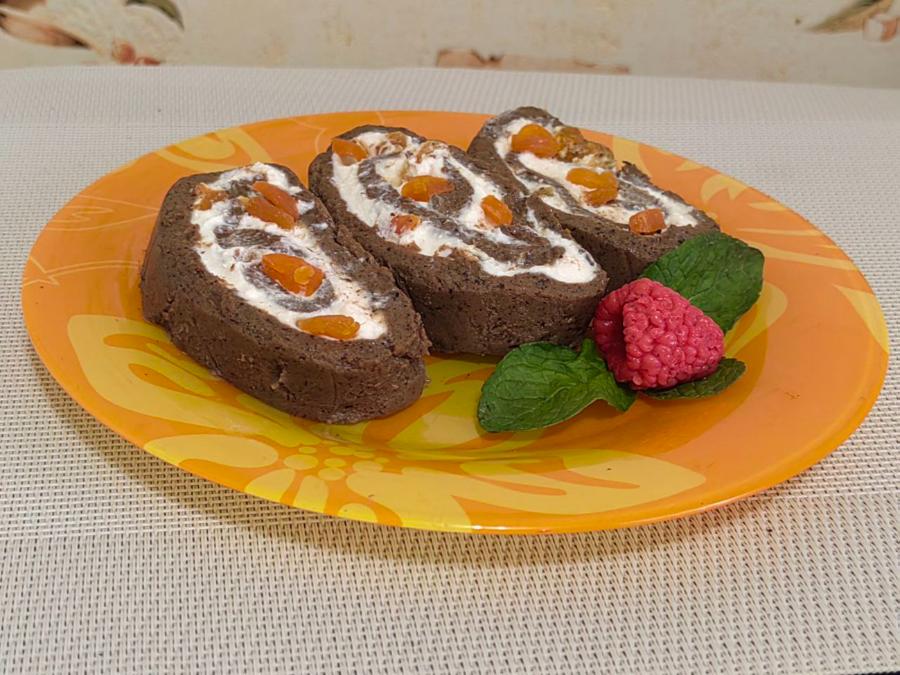 Берем противень, выстилаем его пищевой пленкой. Проще это делать, немного смочив форму водой. Перекладываем на пленку остывший шоколадный крем, разравнивая лопаткой по поверхности. Отправляем в холодильник на минут 15, чтобы масса схватилась. Сверху на шоколадную основу наносим творожный слой. Можно оставить так либо присыпать его ягодами, сухофруктами, измельченным мармеладом или маком. Скручиваем десерт с помощью той же пленки. Отправляем в холодильник до полного застывания.