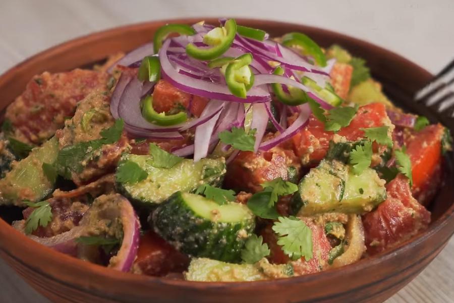 В Грузии этот салат давно стал кулинарной традицией. В меню ресторанов и кафе его можно встретить под разными названиями: «традиционный», «салат из помидоров и огурцов» или просто «грузинский салат». Несмотря на простоту ингредиентов (свежие помидоры и огурцы), блюдо обретает уникальный характер благодаря ароматному ореховому соусу. Кулинарный блогер поделился рецептом.Для приготовления вам понадобятся: