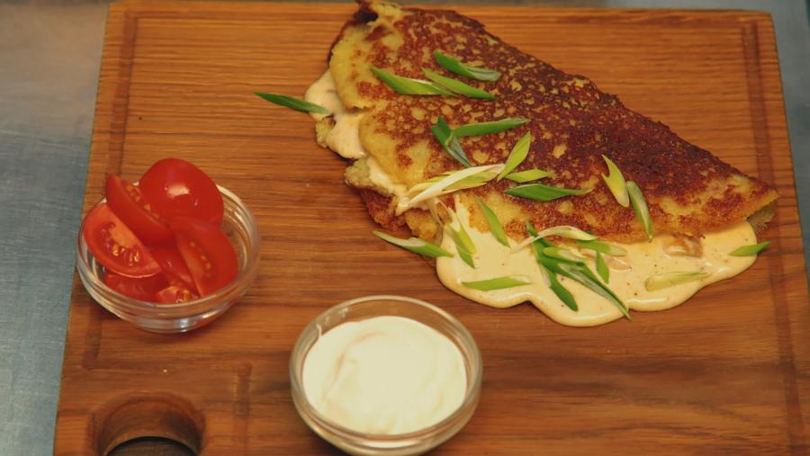 Параллельно поваром нарезаются слайсами свежие шампиньоны (30 г) и, после того как курочка немного схватилась, добавляются к куриному филе. Далее немного солится и перчится зажарка. «Обжариваем вместе продукты недолго, минуты 2-3, этого будет достаточно. Специй никаких добавлять не будем. А зачем? Важно сохранить натуральный вкус продуктов», – комментирует свои действия Ирина, переходя плавно к картофельному пляцеку. Как по мне, так настает самый напряженный и волнительный момент – момент истины, когда блин должен пережить свое первое перерождение. Женщина уверенно поддевает лопатку под пляцек, и на секунду кажется, что она замерла. Затем следует решительный, отточенный бросок. Блин переворачивается, открывая миру свою идеально золотистую, рельефную корочку.