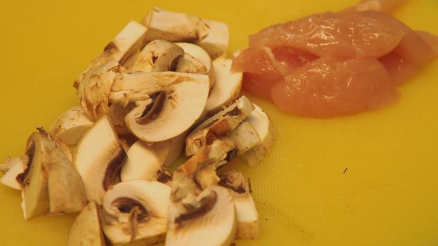 Не теряя времени, Ирина принялась готовить начинку для будущего пляцека. Из холодильника она взяла 50 граммов куриное филе и нарезала тонкими полосками. В это время другая сковорода на кухонной плите, уже разогретая хозяйкой заранее с небольшим количеством растительного масла, нетерпеливо дожидалась своей очереди. И вот курочка уже весело шкварчит на огне, мгновенно меняя свою структуру.