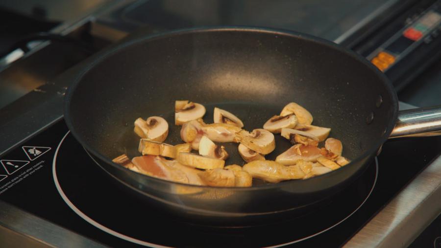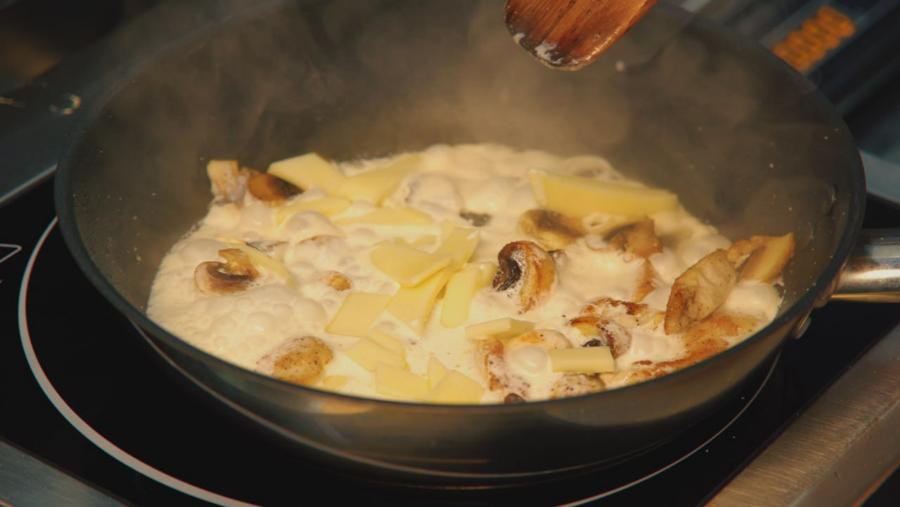 Тем временем огонь на другой сковороде убавляется до минимума, и к курице с грибами щедро вливаются холодные 33% сливки (70 г). Со слов Ирины, чем они жирнее, тем вкуснее. Повар хорошо перемешивает массу, и она мгновенно загустевает. Следом идет сыр моцарелла, нарезанный предварительно слайсами. Его берется 40 граммов. Женщина быстро перемешивает лопаткой полученную зажарку, ждет пару секунд, пока сыр не расплавится. Выключает огонь, снимая сковороду с плиты.