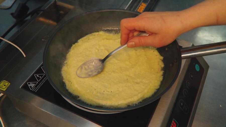Тут и я решаюсь добавить свой маленький, но проверенный годами секретик. Можно в натертую массу положить ложку-две сметаны, картофель также не потемнеет.Затем Ирина вводит в натертую массу 30 граммов репчатого лука, заранее измельченного до прозрачности, немного черного молотого перца и щепотку соли, которая, с ее слов, «открывает вкус картофеля». Добавляет 1/2 куриного яйца и 30 граммов пшеничной муки. «А здесь даже у поваров есть расхождения во мнении. Примерно половина коллег использует в картофельном тесте муку и яйца, другая половина обходится без них», – разводя руками, говорит женщина.