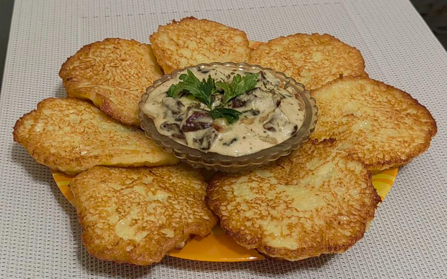 Бульбяники с грибной мачанкойВозвращаясь домой, мне не терпелось приготовить что-то подобное у себя на кухне. Тем более муж просто обожает блюда из тертого картофеля. Ну, настоящий белорус! Одно только тревожило: как шеф-повар оценит мою версию знаменитого белорусского блюда. Знаю, что бульбяники у нас любят все, готовлю их постоянно, и они никогда не приедаются. Часто экспериментирую с соусами, зажарками. Лично для меня ничего нет лучше обычной жирной сметаны! Что уж и говорить, самое привычное с детства сочетание – классика жанра. Подаю блюдо в качестве сытного завтрака (правда, только по выходным), обеда или легкого ужина. Итак, долой волнения! Готовим вместе со мной бульбяники с грибной мачанкой.