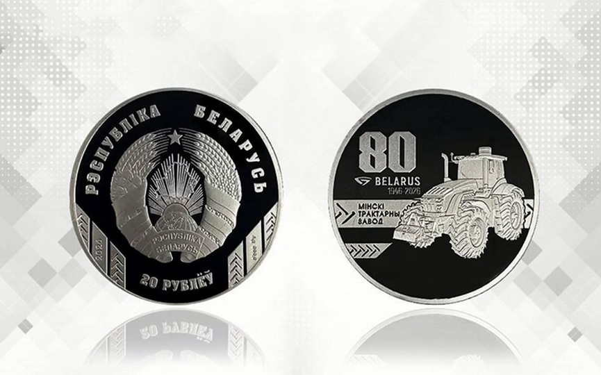 На реверсе монет в центре справа - изображение трактора, в центре слева надпись: "80 BELARUS 1946 - 2026, МІНСКІ ТРАКТАРНЫ ЗАВОД".