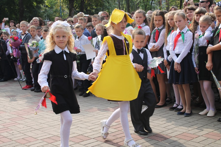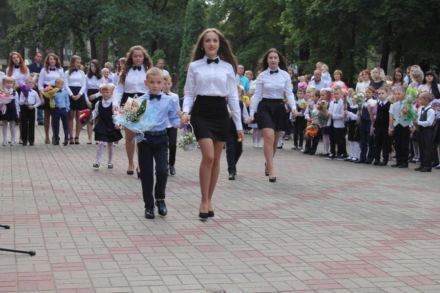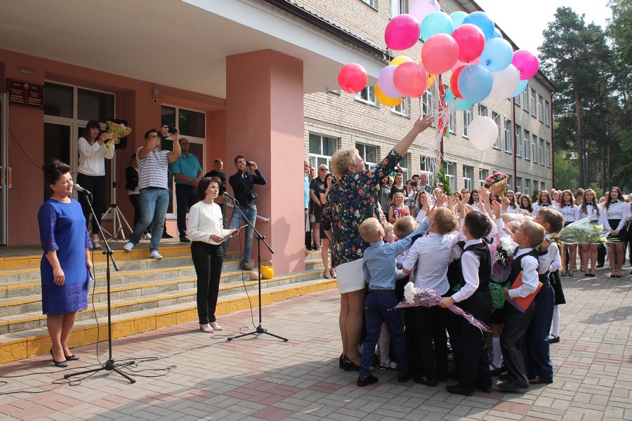 По окончании линейки малыши-первоклассники отпустили в небо разноцветные шары, а первый звонок поручено было пронести четверокласснице Надежде Бештень и первоклассникам Глебу Кострубенко и Каролине Гаврилкевич.