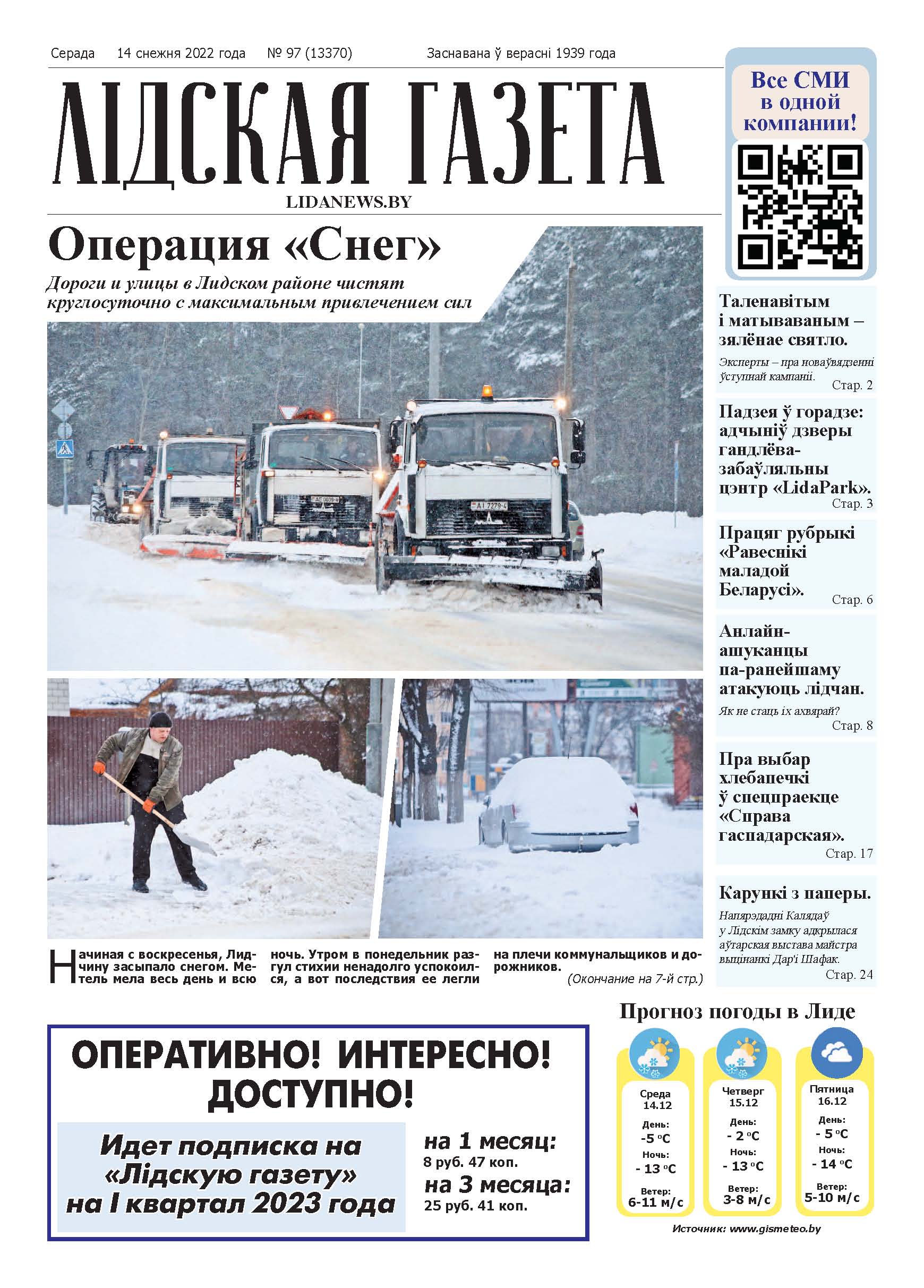 Подборку актуальных новостей и интересных материалов предлагает номер «Лідскай газеты» за 14 декабря 2022 г.* «На планерке у председателя райисполкома». Уборка снега, подготовка к проведению централизованных экзаменов, организация предновогодних мероприятий.