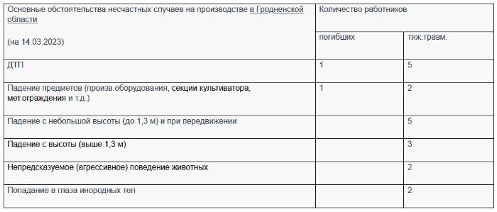 В Гродненской области в текущем году (по состоянию на 14.03.2023) в несчастных случаях на производстве погибли 3 человека и 23 – получили тяжелые травмы (по оперативной информации).