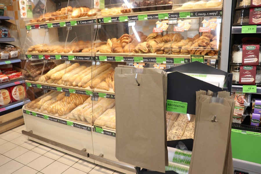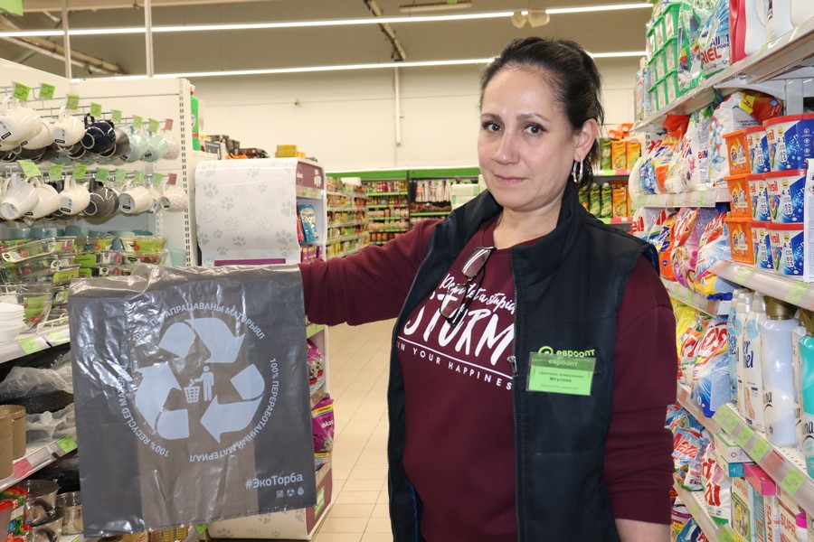 На кассах покупателям помимо полиэтиленовых пакетов предлагаются текстильные сумки зеленого цвета с логотипом торговой сети и бумажные пакеты стоимостью соответственно 1 рубль 49 копеек и 89 копеек, а также экоторбы для промышленных товаров стоимостью 40 копеек. То есть торговое предприятие делает шаги в сторону экологически безопасной упаковки. Пускай небольшие, но если в каждой организации будут делать такие же шаги, получится общее ощутимое движение вперед.