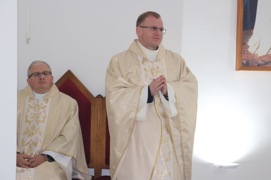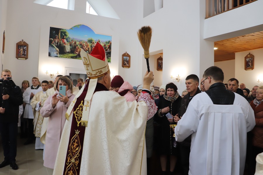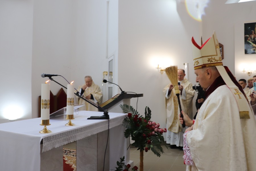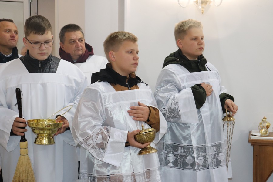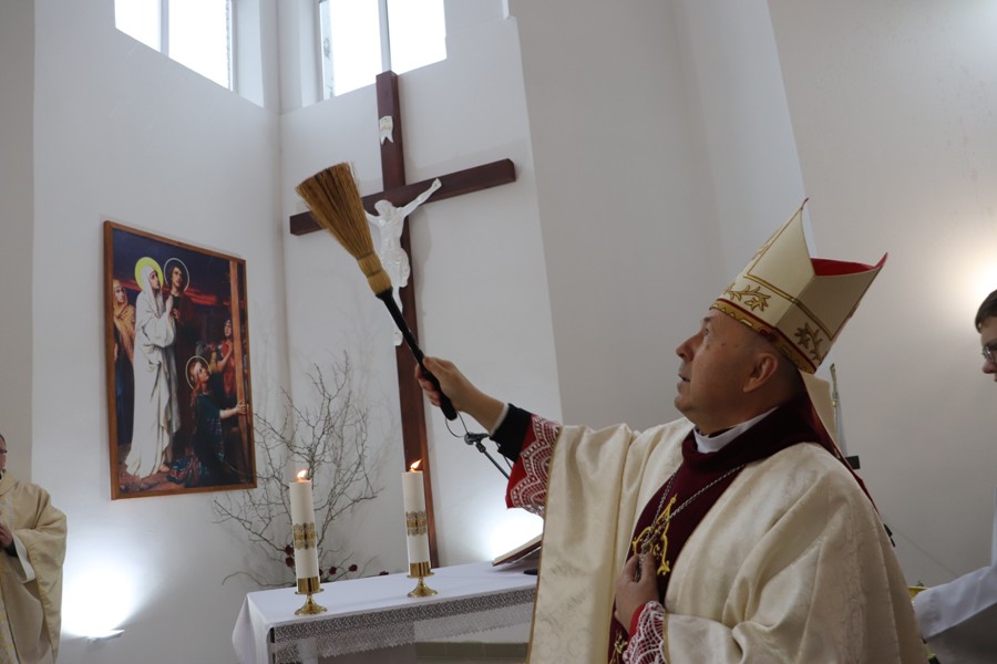 Напачатку Эўхарыстыі біскуп Аляксандр Кашкевіч здзейсніў абрад асвячэння вады, якой акрапіў сцены капліцы, алтара і ўсіх прысутных.