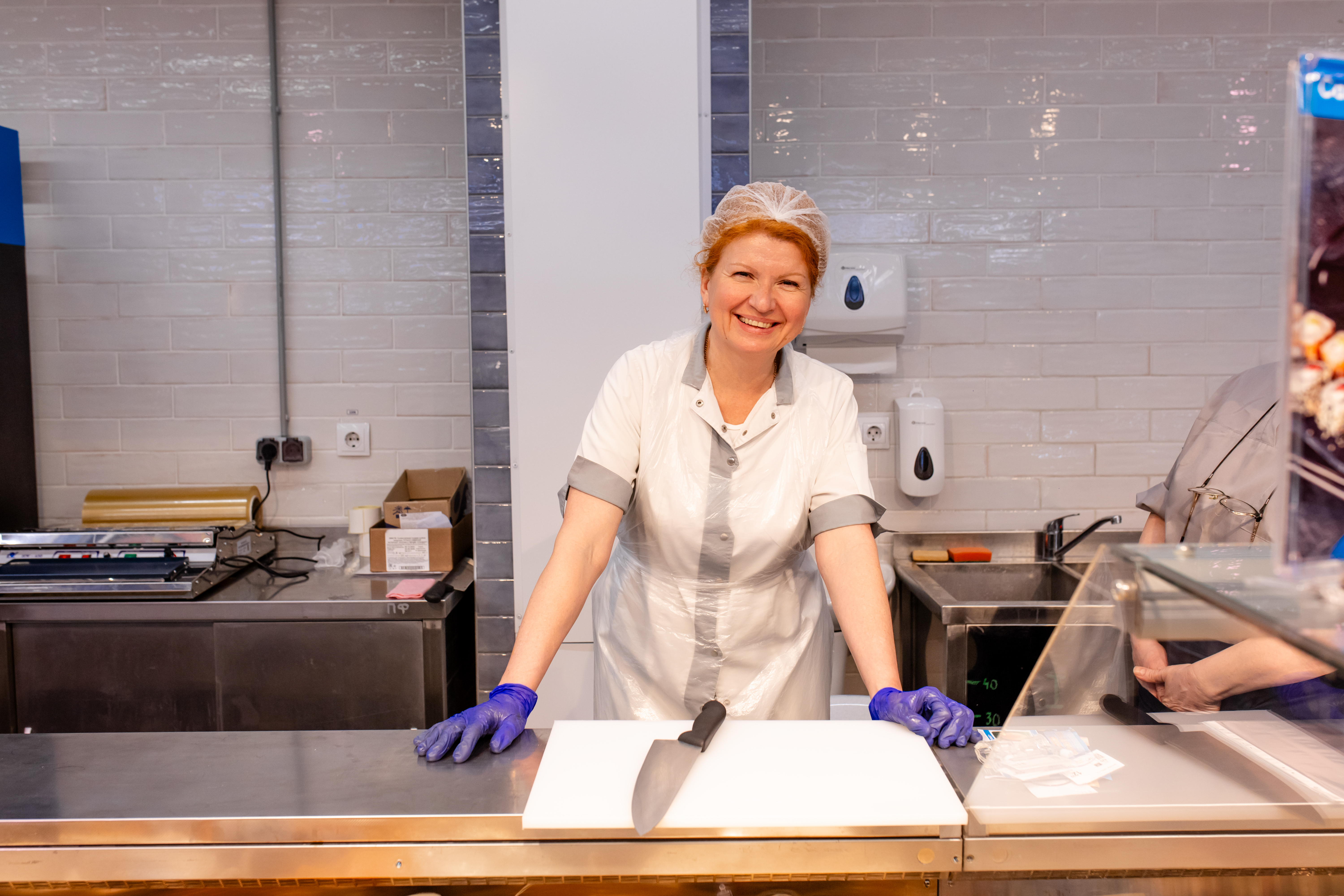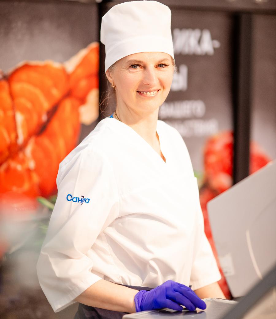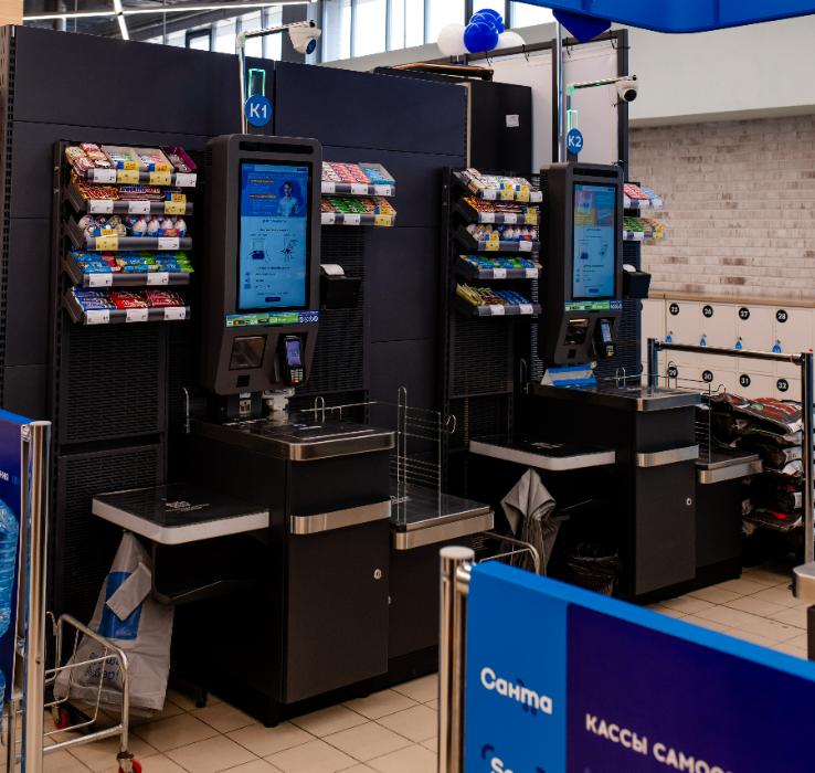 Четыре кассы самообслуживания в дополнение к трем обычным спасают от очередей. А яркие ценники с акциями («Ай да цена!», «Рыбные дни», «Сочное предложение» и «Санта Шок») словно подмигивают: «Эй, возьми меня, это выгодно!».