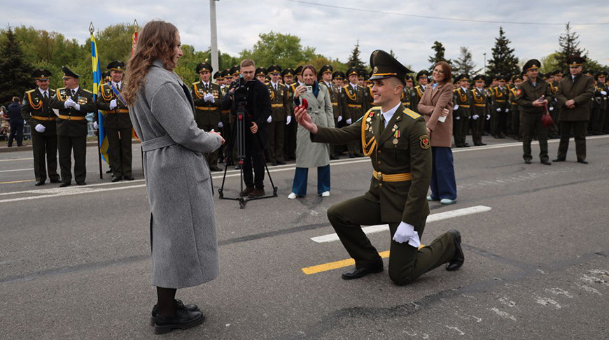 Участник военного парада, посвященного Дню Великой Победы, перед его началом сделал предложение руки и сердца своей возлюбленной. Об этом БЕЛТА сообщили в Министерстве обороны.Как рассказали в Минобороны, прямо перед началом военного парада один из его участников, лейтенант Владимир Астафьев, сделал предложение выйти замуж своей девушке Дарье. Его возлюбленная согласилась. Под аплодисменты зрителей парада военнослужащий надел кольцо на палец Дарьи и подарил букет.