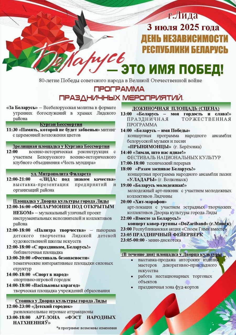 В 11 часов 30 минут на Кургане Бессмертия состоится митинг с церемонией возложения цветов. А в 12 часов здесь же на зрелищной площадке пройдет военно-историческая реконструкция с участием Белорусского военно-исторического клубного объединения «Честь мундира». В 13 часов на Дожиночной площади начнется торжественная программа «Беларусь – моя гордость и слава!» Позже здесь же выступят творческие коллективы из Лиды, Березовки и Волковыска. В 22 часа на сцену выйдет кавер-группа «DoZari band» из Минска. В 23 часа лидчан объединит республиканская акция «Споем Гимн вместе», а уже в 23.05 небо над городом украсит праздничный фейерверк. На протяжении дня на улице Митрополита Филарета будет работать выставка-презентация предприятий и организаций района, у Дворца культуры разместятся различные площадки: творческая, библиотечная, тематические интерактивные площадки силовых структур, спортивно-игровой городок. Будут работать выставки-продажи, аттракционы, фуд-корты. Отпразднуем вместе важный день в жизни страны!