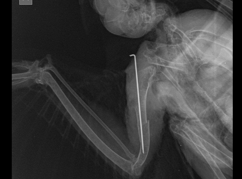 – Мы сделали рентгеновский снимок, на котором виден открытый перелом правого крыла со смещением мягких тканей. Поэтому пришлось провести остеосинтез кости. Говоря простым языком, в крыло птице была введена осевая спица, которая поможет тканям срастаться, – рассказывает ветврач. Павел Жульпа поясняет: птицы очень тяжело переносят наркоз, однако в данном случае операция прошла успешно. Ястреб пришел в себя и уже несколько дней находится в стационаре клиники под круглосуточным наблюдением врачей.