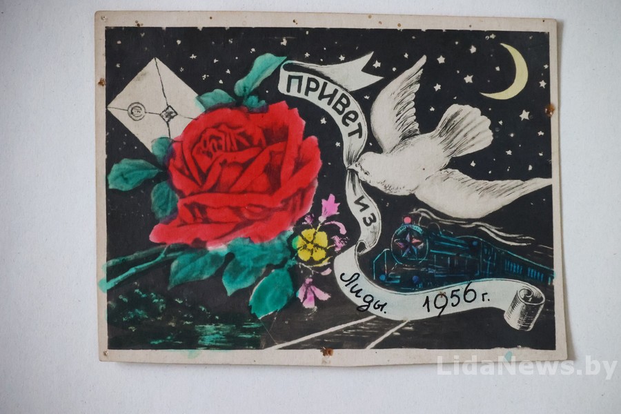 – Дело в том, что раньше функцию открыток выполняли фотографии, на обратной стороне которых печатался почтовый шаблон. Их пересылали в другие города или просто дарили на память. Такие открытки изготавливались в фотоателье. К примеру, на карточке, датированной 1937 годом, изображен пехотинец, который проходил службу в Лиде. Судя по надписи на самой открытке, сделана она в фотоателье Е. Барышанского, что находилось по улице Сувальской, 66 (ныне Советской). Есть также изображение железнодорожного вокзала нашего города с подписью «на память». А это фотооткрытка 1956 года: на ней написано. «Привет из Лиды!» Такое вот послание из прошлого.