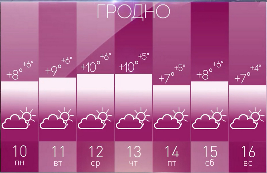 В выходные на погоду станет оказывать влияние антициклон. Существенных осадков не ожидается. Ветер западный, северо-западный, умеренный. Ночью и утром туман, видимость до полукилометра Влажность до 70%. Ночью от +1°C до +6°C, в середине дня в субботу – +5…+9°C, в воскресенье от +1°C в Витебске до +8°C в Бресте.