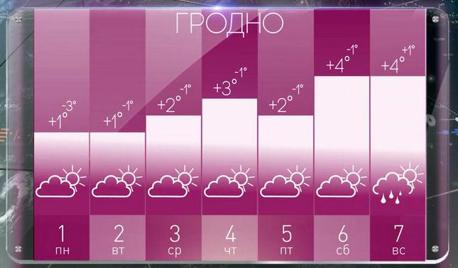 В начале недели Беларусь окажется на западной периферии обширного антициклона с центром над Средней Волгой. Поэтому будет преобладать облачная, с прояснениями, погода; существенных осадков не ожидается. Ночью и утром местами – туман, слабый гололед; на дорогах – гололедица. Ветер южной четверти, умеренный. Влажность воздуха до 90 процентов. Температура воздуха ночью – от -2°С до +3°С. Днем: в понедельник – от +1°С до +5°С, во вторник – от +1°С до +6°С.