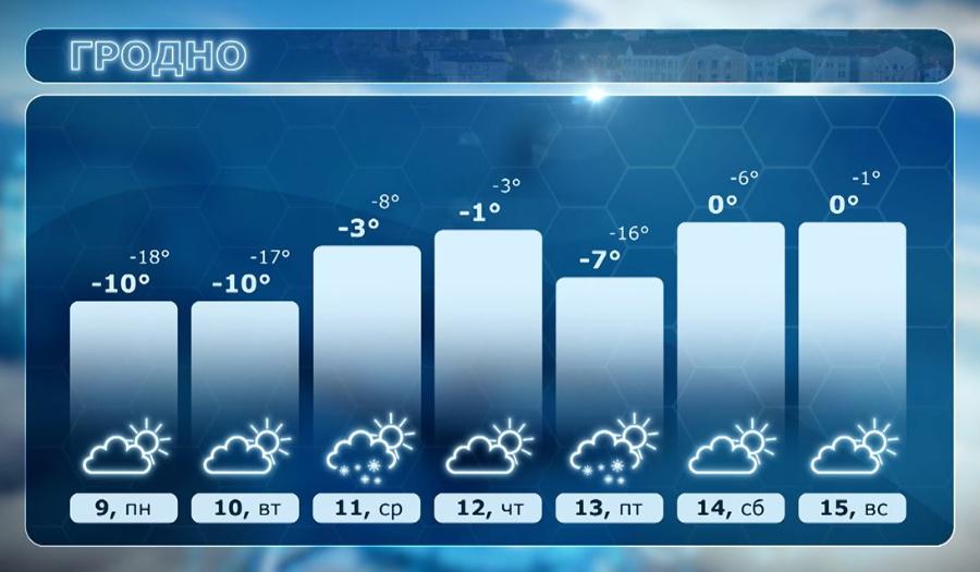 11 февраля через Беларусь станет проходить атмосферный фронт, который принесет небольшое ослабление морозов и снег. Будет облачно с небольшими прояснениями. На дорогах местами гололедица и туман. Ветер поменяется на южный и будет умеренным. Температура ночью ожидается от -8°C по юго-западу до -20°C по северо-востоку. Днем холоднее всего будет в Витебске – до -8°C, а теплее в Бресте – здесь около 0°C.