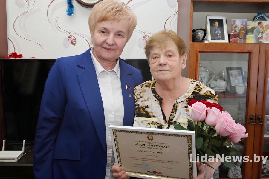 За личный вклад в развитие стекольной промышленности Лидского района, активную общественную деятельность и в связи с 75-летием Инесса Белуш наградила Тамару Евгеньевну Почетной грамотой Лидского районного исполнительного комитета.
