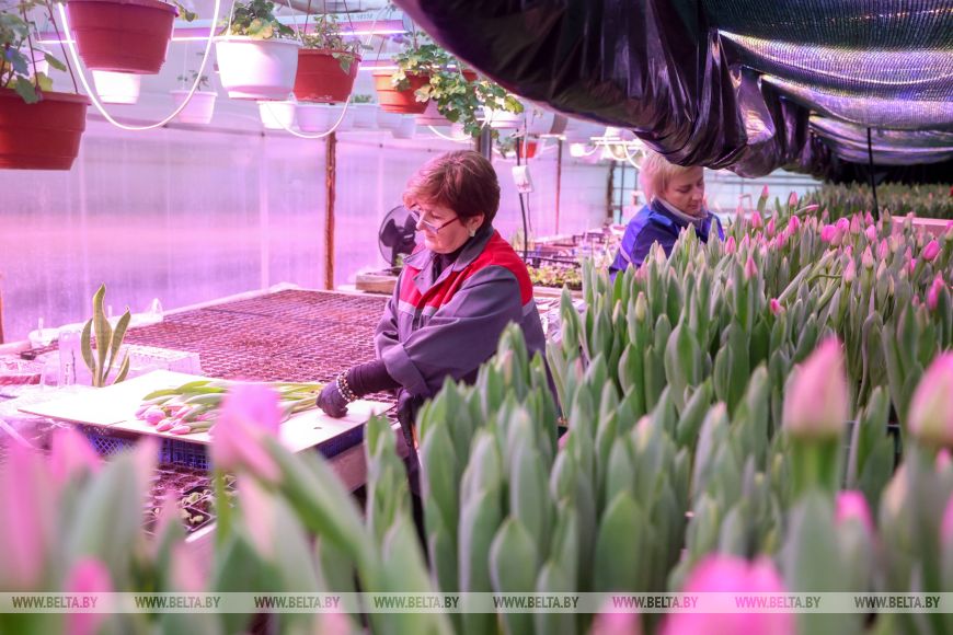 Агроном 4-го участка Ирина Руденок, общий стаж которой насчитывает более 20 лет, делится, что многое в выращивании зависит от выбора сорта. "Каждый имеет свои сроки выгонки - средний, поздний и ранний. Если все в одну теплицу, то сроки будут сдвинуты. Температурный режим тоже им нужен разный. Мы же играем за счет температуры, влажности и освещения, поэтому умудряемся выгнать и поздние сорта, и ранние к 8 Марта", - рассказывает она. Ирина Руденок делится, что ей лично по душе больше пионовидные тюльпаны, которые отличаются интересной формой бутона, окрасом, а еще, по ее словам, очень долго стоят после срезки и радуют ароматом.