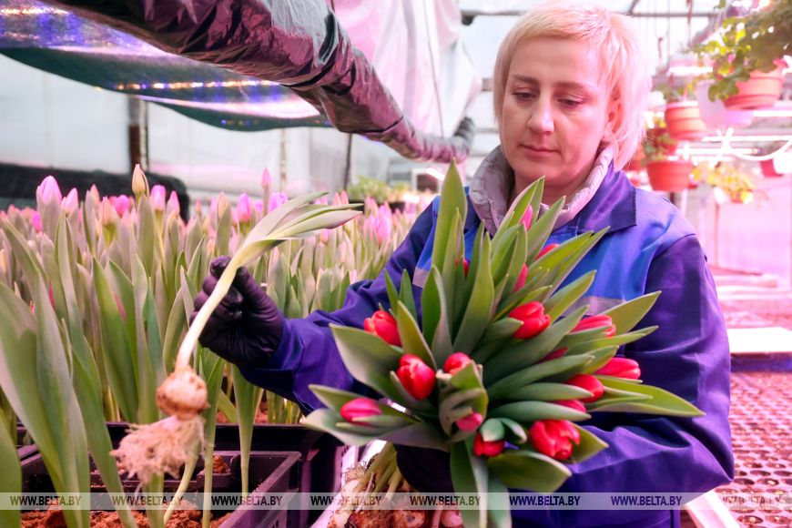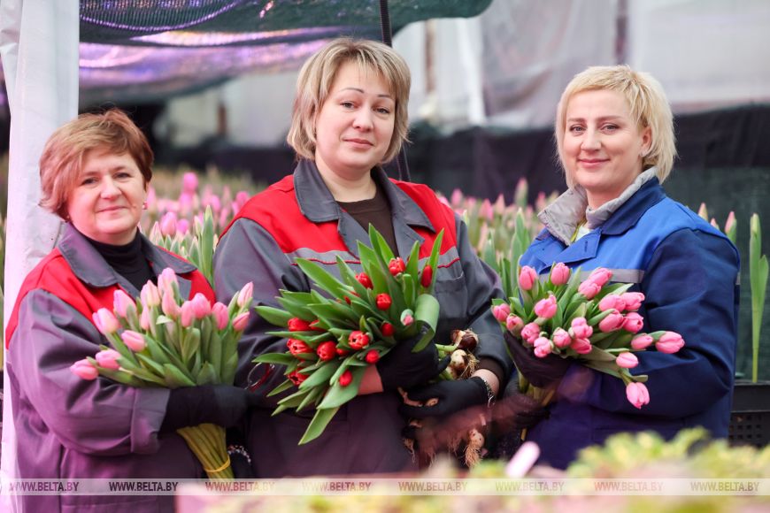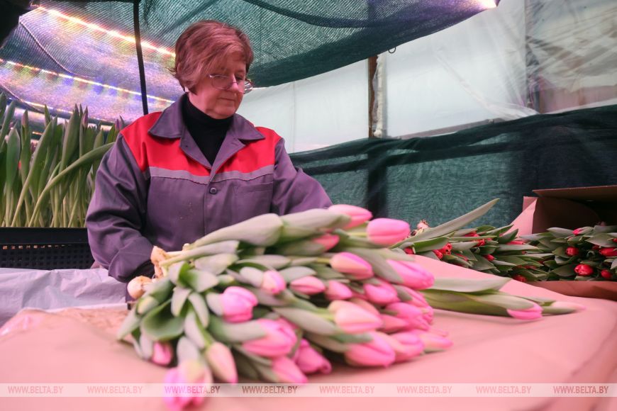 На Гродненской овощной фабрике уже третий год выращивают цветы, без которых сложно представить 8 Марта, - тюльпаны. Объемы небольшие, всего 6 тыс., но от того не меньше хлопот и заботы вокруг цветов, которые будут радовать жительниц города над Неманом. Сегодня здесь начали срезку тюльпанов. Корреспонденты БЕЛТА узнали о нюансах выращивания и не только.Качество цветка зависит в первую очередь от луковицы. "Она должна быть большая, крупная, желательно в диаметре 11-12 см. После закупки луковица должна пройти период охлаждения. Дальше в зависимости от условий, в которых мы выращиваем, подбирается технология. Мы, например, высаживаем луковицы в ящики с торфом, песком и удобрениями в конце ноября. Три месяца они укореняются: бутоны спят, созревают внутри луковицы, а корень растет. Потом (обычно это совпадает с Татьяниным днем) мы повышаем температуру - вносим их в теплицу. В период, когда завязывается бутон, обязательна подсветка, подкормка, полив и уход. Месяц требуется для того, чтобы бутон проснулся, сформировался, приобрел свой окрас. В стадии окрашенного тюльпана уже идет срезка", - рассказывает о нюансах выращивания начальник участка №4 Ирина Бычек.