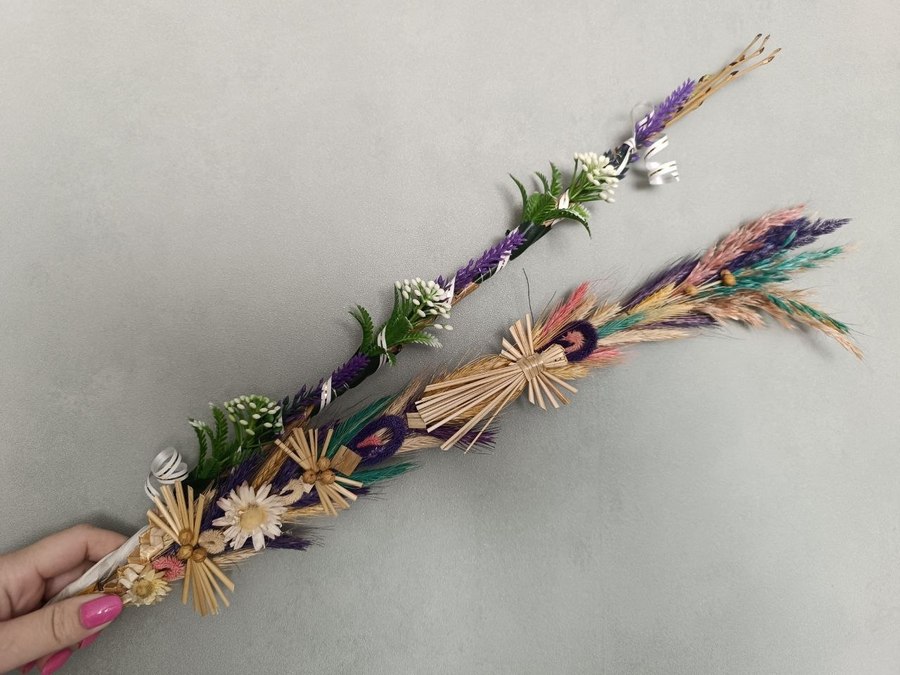Также можно использовать засушенные травы, покрашенные в разный цвет, цветы-суховейки, солому, колоски, декоративные элементы в виде пасхальных яиц, птичек и т.д.