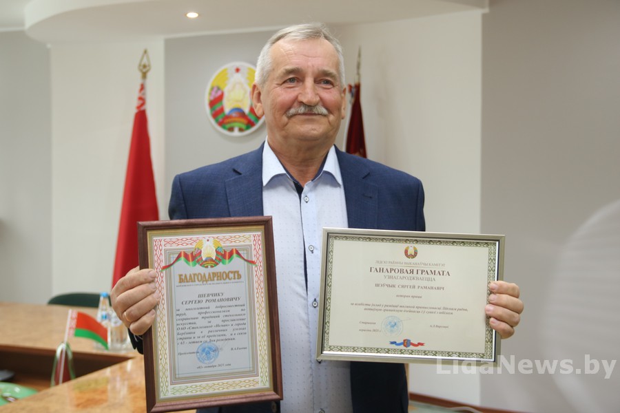 За личный вклад в развитие стекольной промышленности Лидского района, активную общественную деятельность и в связи с 65-летием Сергей Шевчик был награжден Почетной грамотой Лидского районного исполнительного комитета.