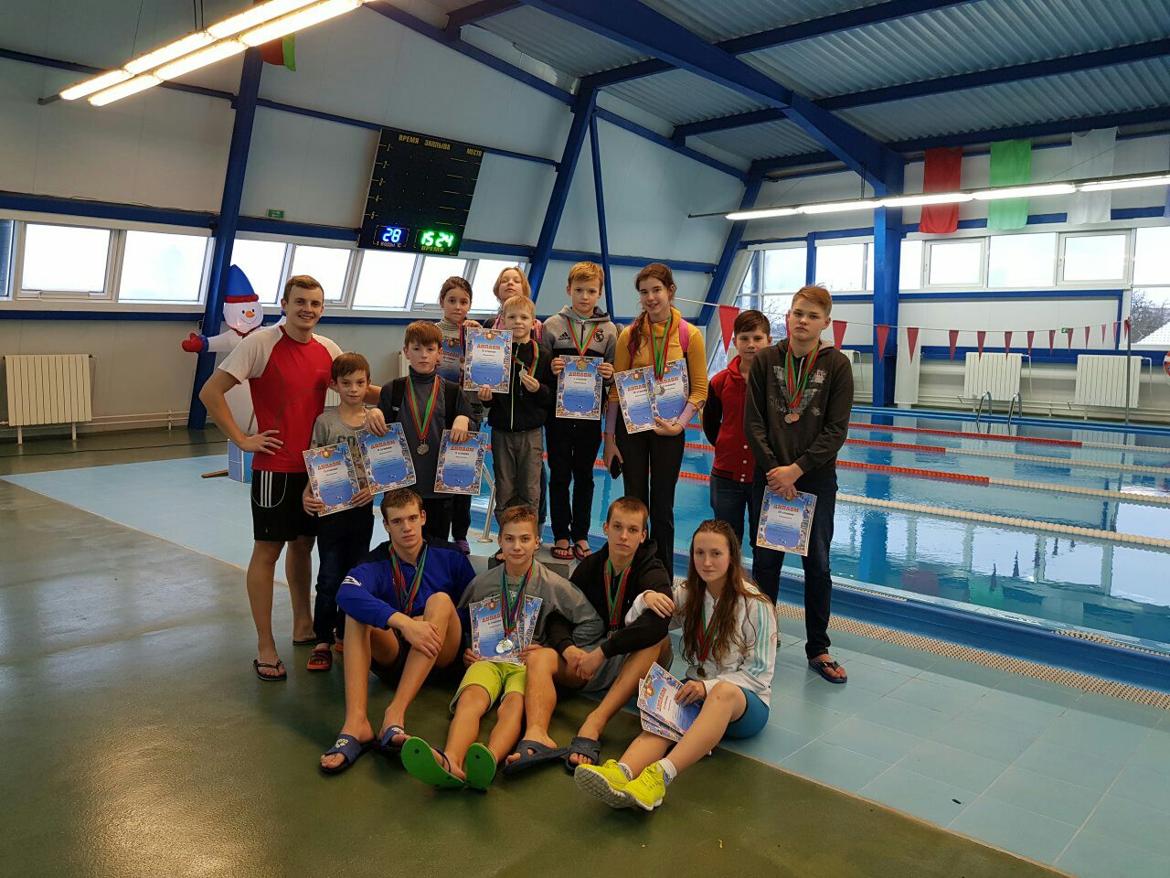 В эстафетном плавании 4 по 50 метров комплексным плаванием наша команда заняла второе место. В ее состав вошли Екатерина Соколова, Илья Кореневский, Герман Рудевич и Александра Кудин.