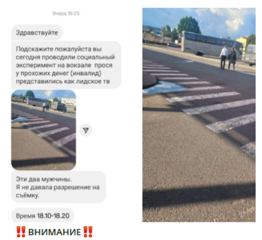 В редакцию Лидамедиакомпании поступили тревожные сообщения от бдительных подписчиков. 1 августа около 18:00 в районе автовокзала города Лиды был замечен человек, активно привлекавший внимание прохожих. Неизвестный представлялся сотрудником Лидского телевидения и заявлял о проведении социального эксперимента под названием «Инвалид». Под этим предлогом он просил у горожан денежные средства.