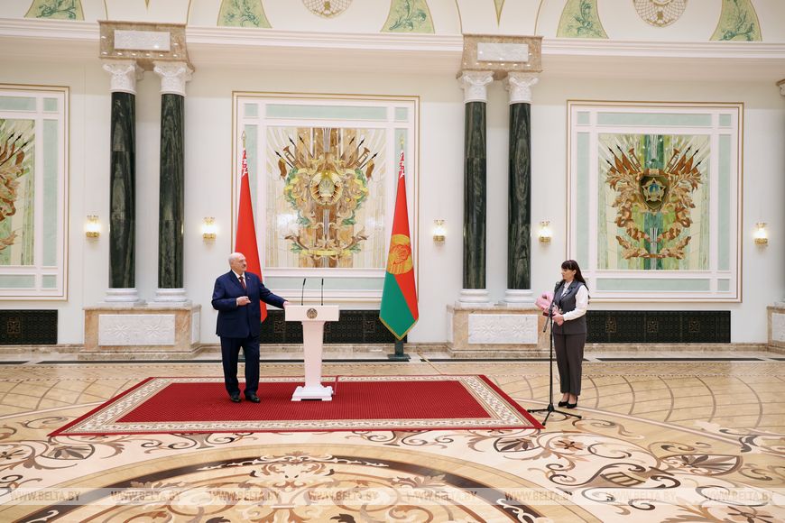 Глава государства вручил орден Почета начальнику управления образования Гродненского райисполкома Татьяне Аксамит, медаль "За трудовые заслуги" - начальнику производства ООО "Управляющая компания холдинга "Белорусская кожевенно-обувная компания "Марко" Анжеле Алферонок, инженеру-технологу технического отдела Оршанского льнокомбината Ирине Беляковой, ведущему научному сотруднику отдела технологии плодоводства Института плодоводства Надежде Капичниковой.