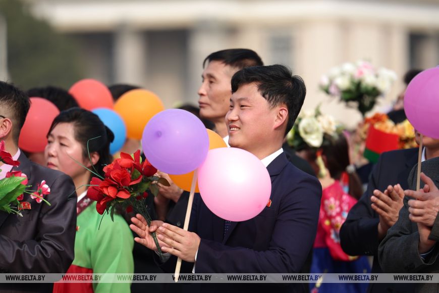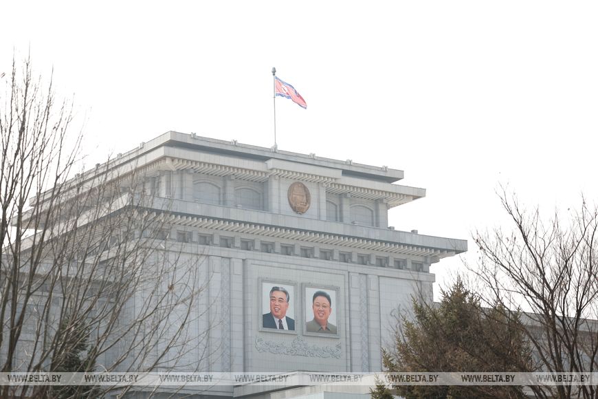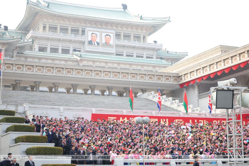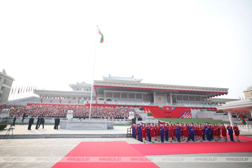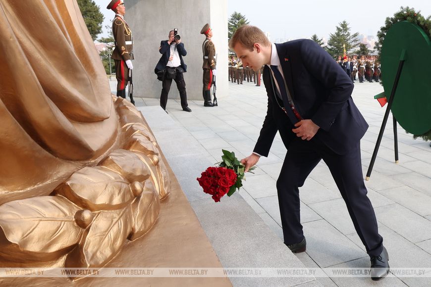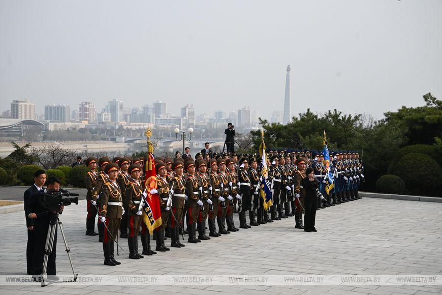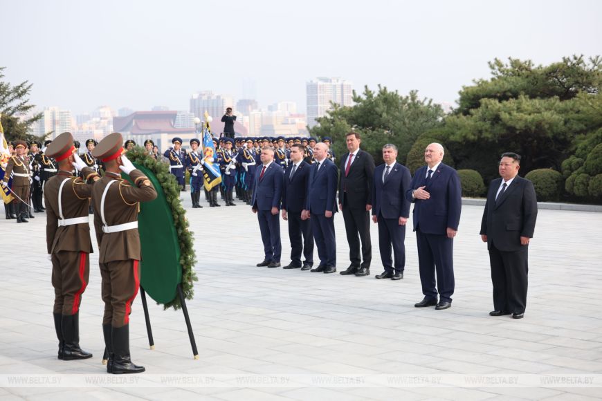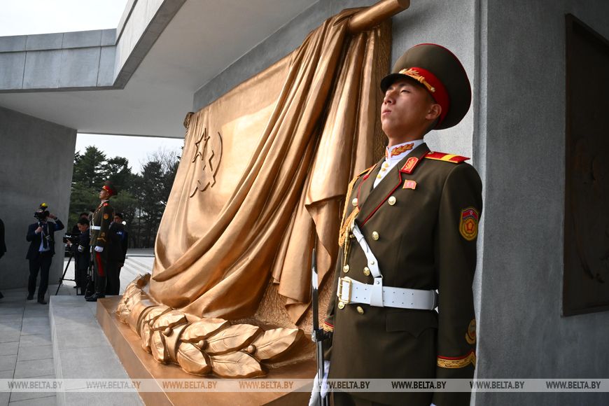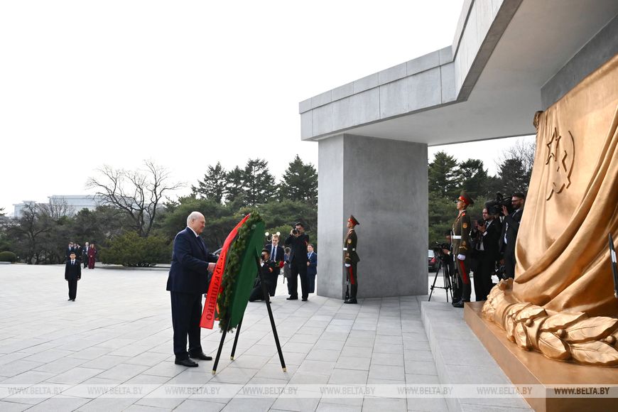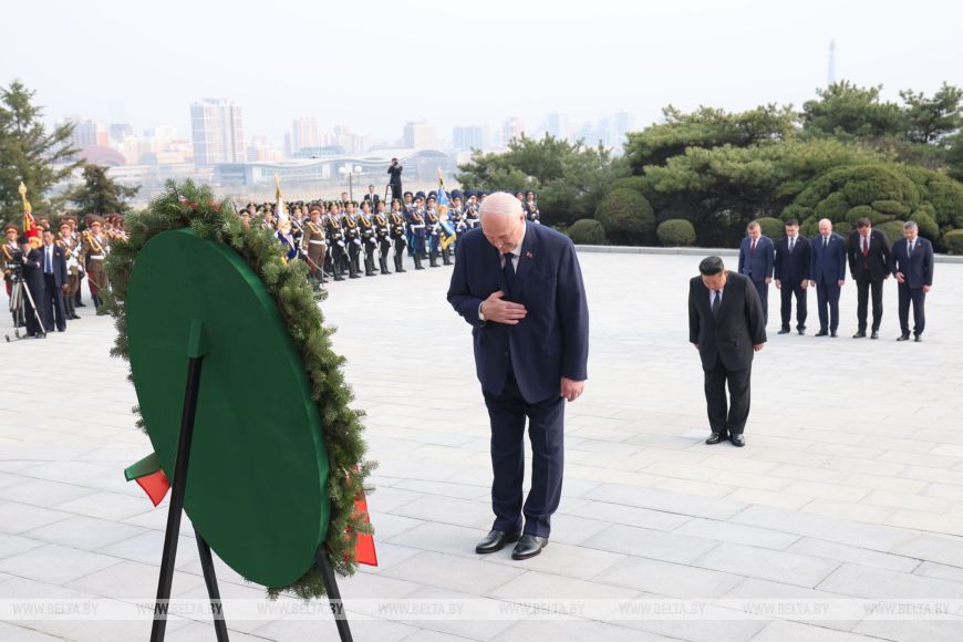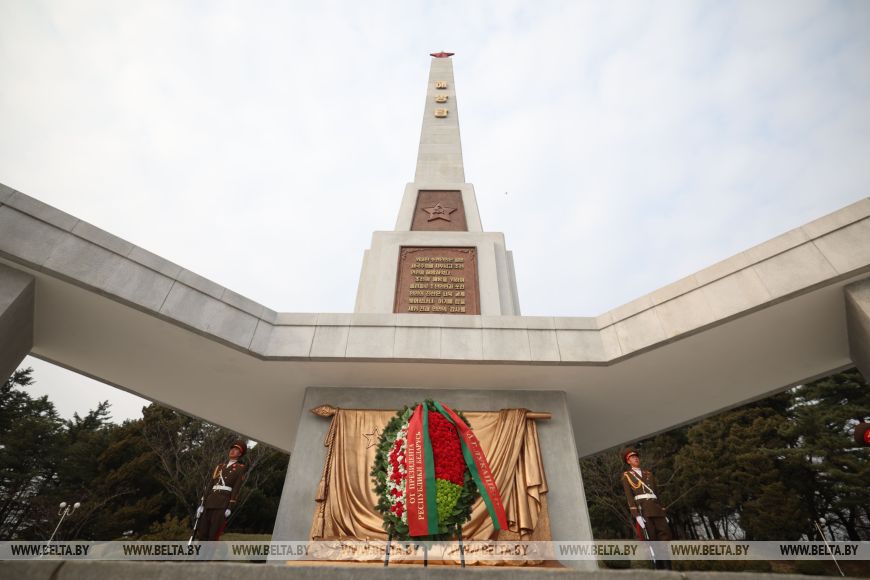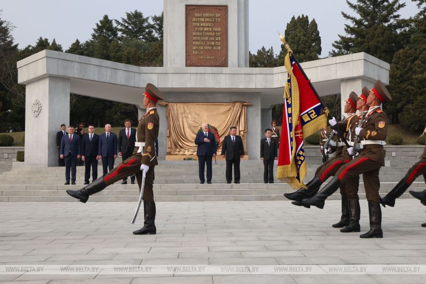 Глава государства почтил память советских воинов, погибших при освобождении Кореи от японских захватчиков, была объявлена минута молчания. Здесь также были исполнены гимны Беларуси и КНДР.