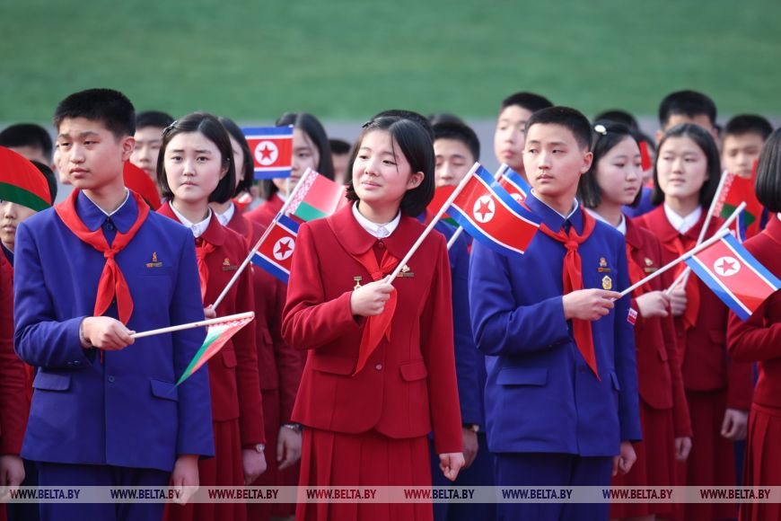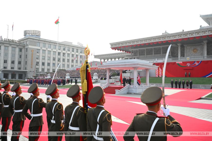 Церемония официальной встречи Президента Беларуси Александра Лукашенко Председателем Государственных дел Корейской Народно-Демократической Республики Ким Чен Ыном прошла в Пхеньяне, передает корреспондент БЕЛТА.Местом для проведения красочной церемонии стала площадь имени Ким Ир Сена, названная в честь основателя КНДР и открытая в 1954 году. Это главная площадь страны и один из символов Пхеньяна. Она вмещает до 100 тыс. человек и является местом проведения военных парадов, государственных праздников и других массовых мероприятий.